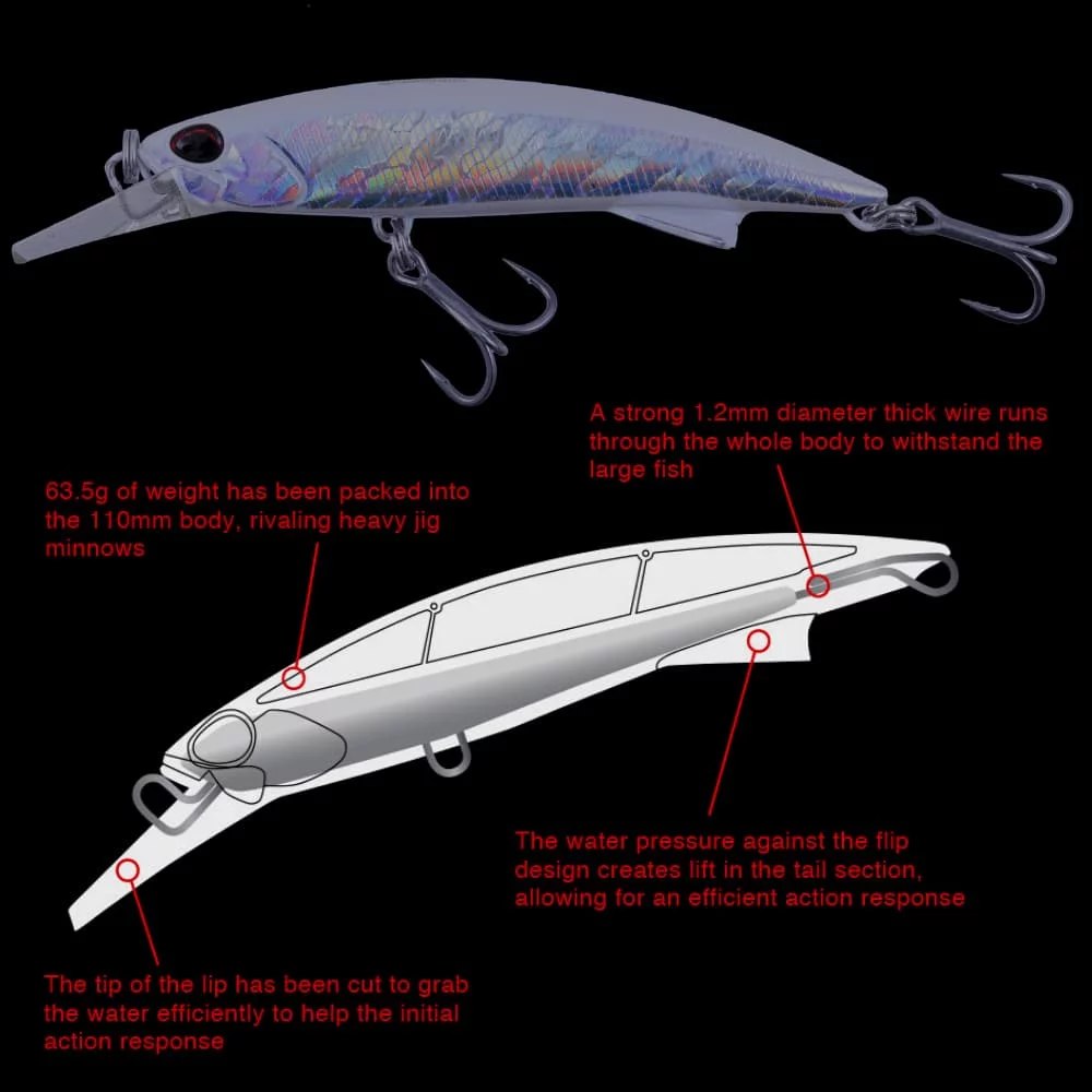 • Malice est un jig-minnow conçu pour la pêche au lancer en haute mer, ciblant le thon, la bonite et autres espèces prédatrices. La clé pour cibler ces espèces réside dans la descente horizontale. Il faut également tenir compte de la flottabilité et de la résistance de l’eau dues à l’utilisation de bas de ligne épais. Afin d’optimiser les lancers, le leurre a été lesté. Cependant, nous souhaitions obtenir un leurre présentant à la fois un poids important et une descente lente. Nous sommes convaincus qu’une fois le Malice en main, les pêcheurs apprécieront le savoir-faire déployé pour obtenir cette forme si naturelle. Malgré son corps fin, la résistance de l’eau permet d’imiter à la perfection la descente lente d’un poisson mort. L’équilibre du poids a été finement ajusté pour compenser ces caractéristiques contradictoires.